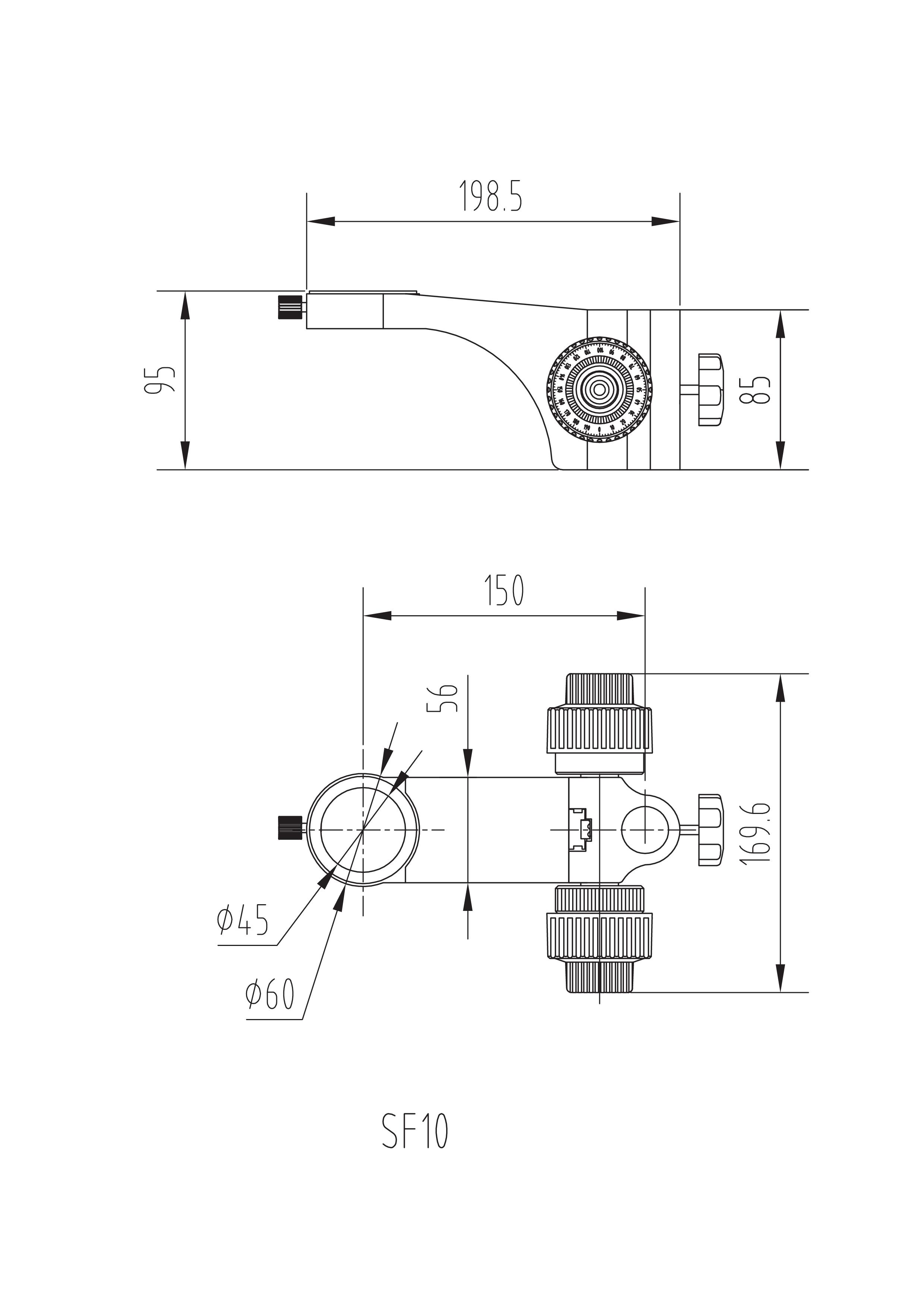 型號名稱:SF10升降組 說 明: ● 粗微調同軸手輪,可調整粗動調節手輪張力 ● 鏡體安裝孔直徑Φ45mm ● 立柱安裝孔直徑Φ25mm ● 鏡體安裝孔與立柱安裝孔中心距150mm